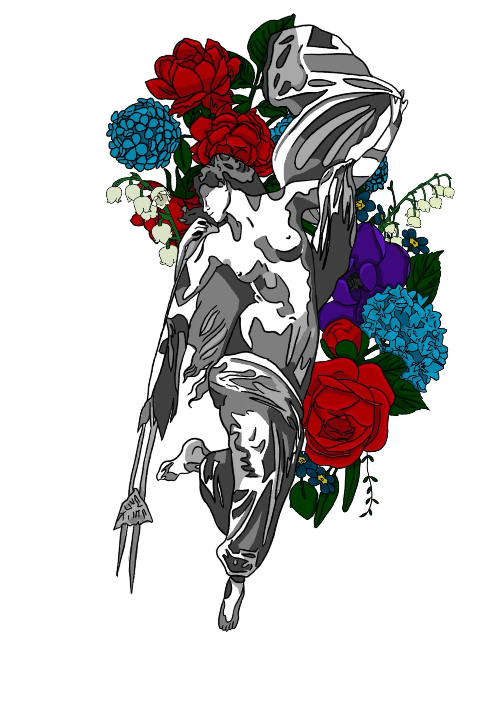 A grayscale classical statue contrasted with vivid pink and purple florals, merging realism and tattoo-style design in a striking composition.