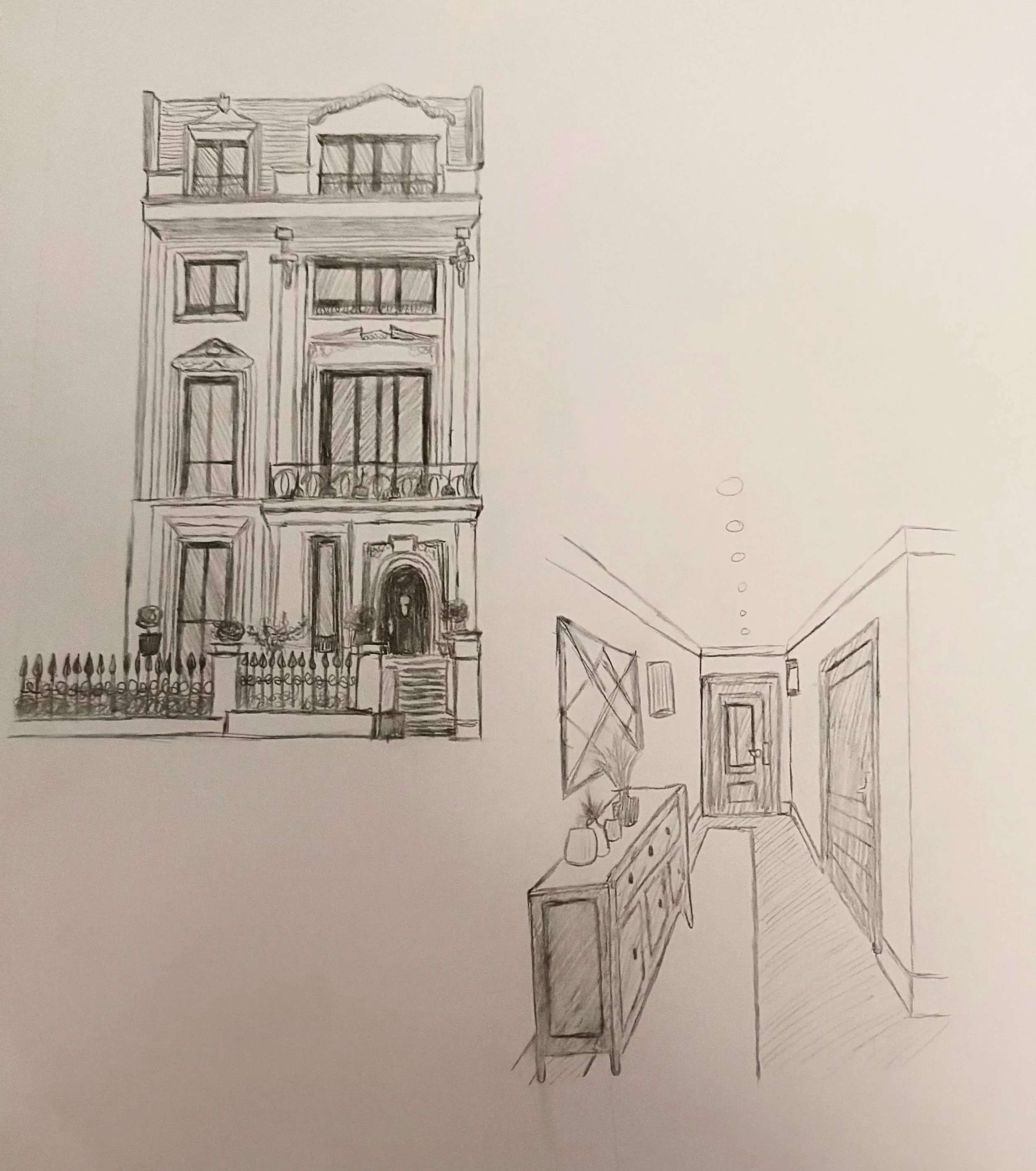 A two-part architectural drawing depicting the outside and inside of an apartment building, focusing on structure, scale, and the quiet transition between shared and personal spaces.